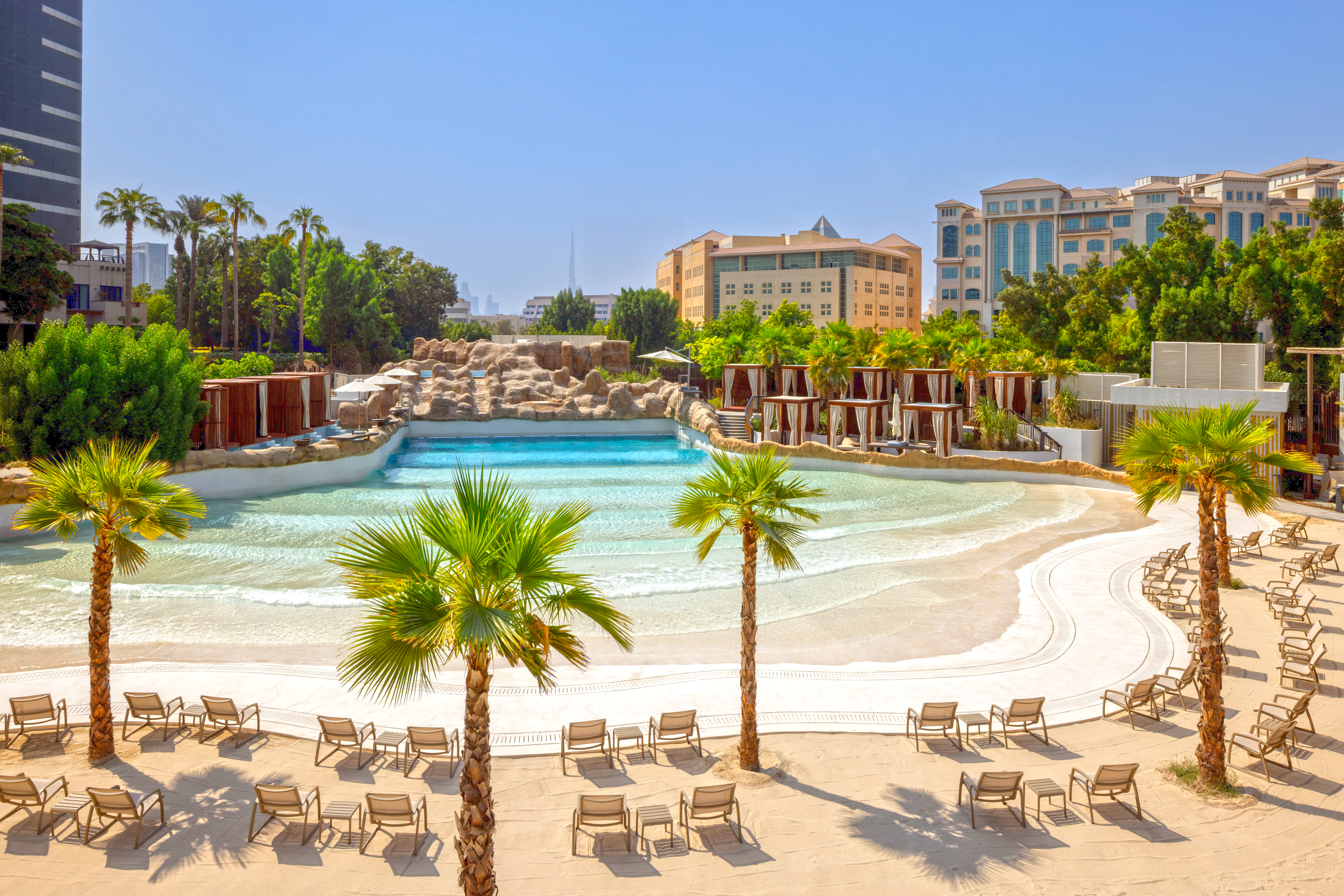 Hotel guests and local residents can enjoy the water park through day passes, allowing the property to seamlessly blend urban exploration with resort-style leisure. Surrounded by lush landscaping and anchored by a wave pool with a sandy beach, the water park feels worlds away from the city, with only the passing monorail hinting at its urban setting.