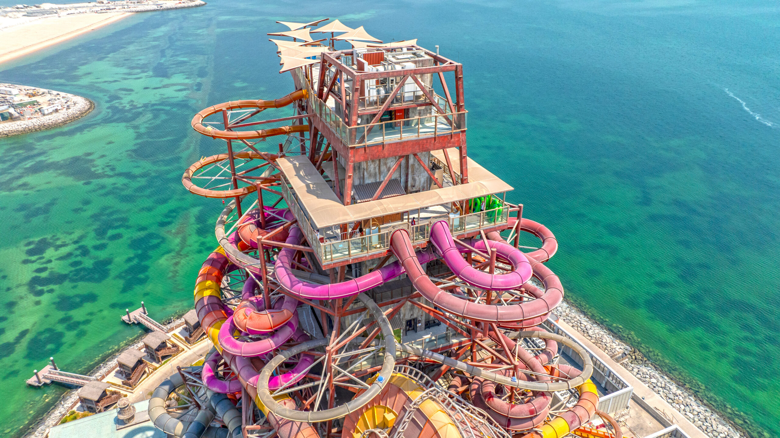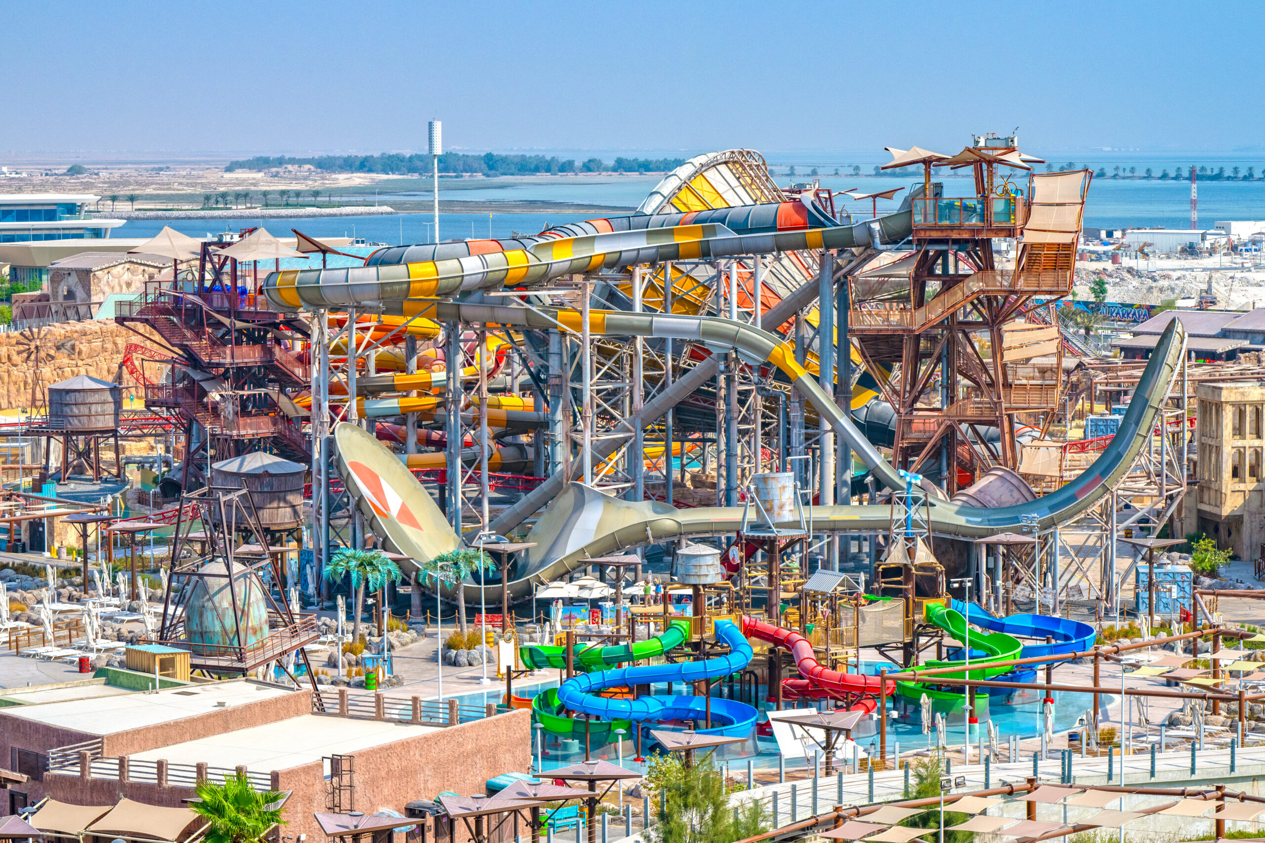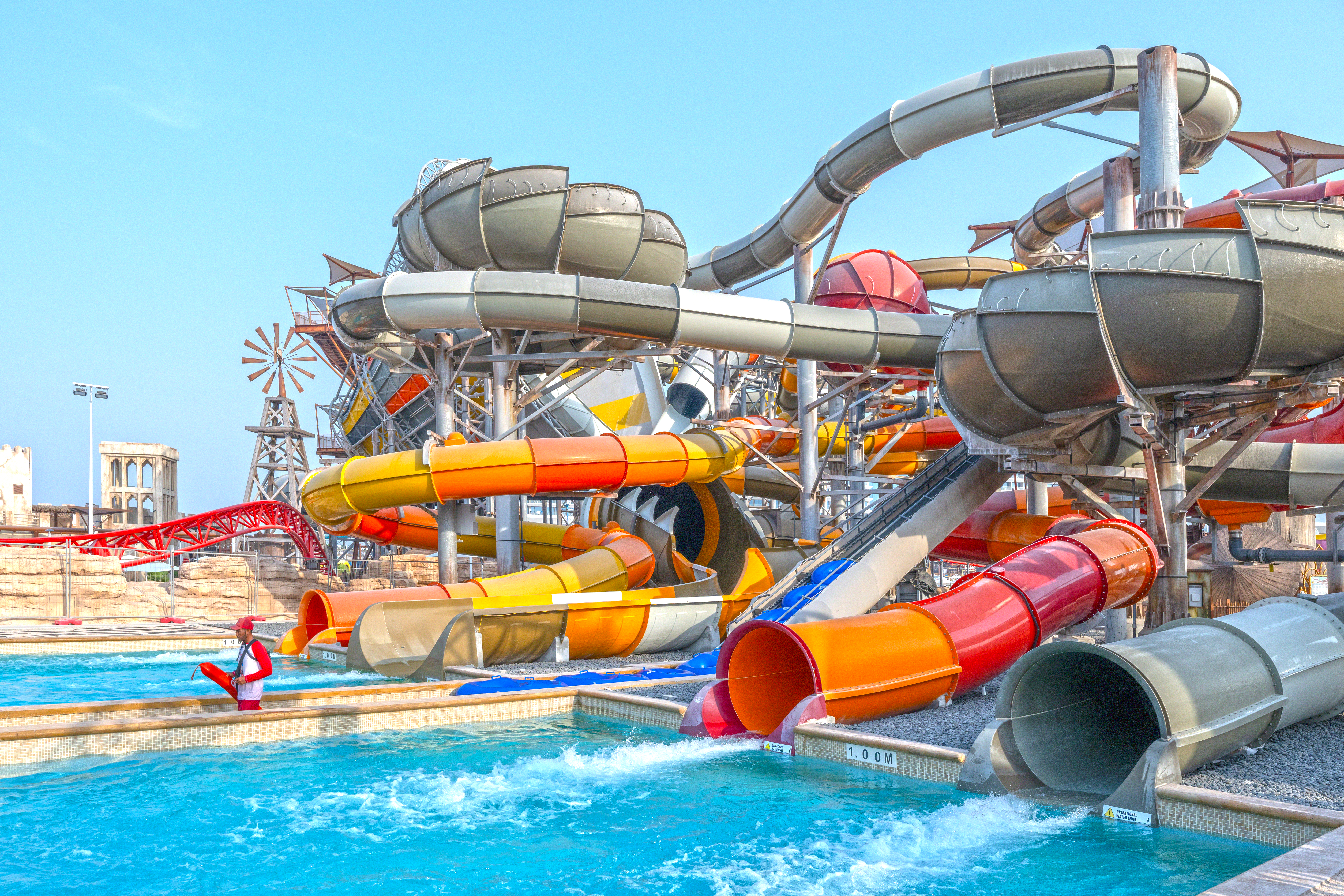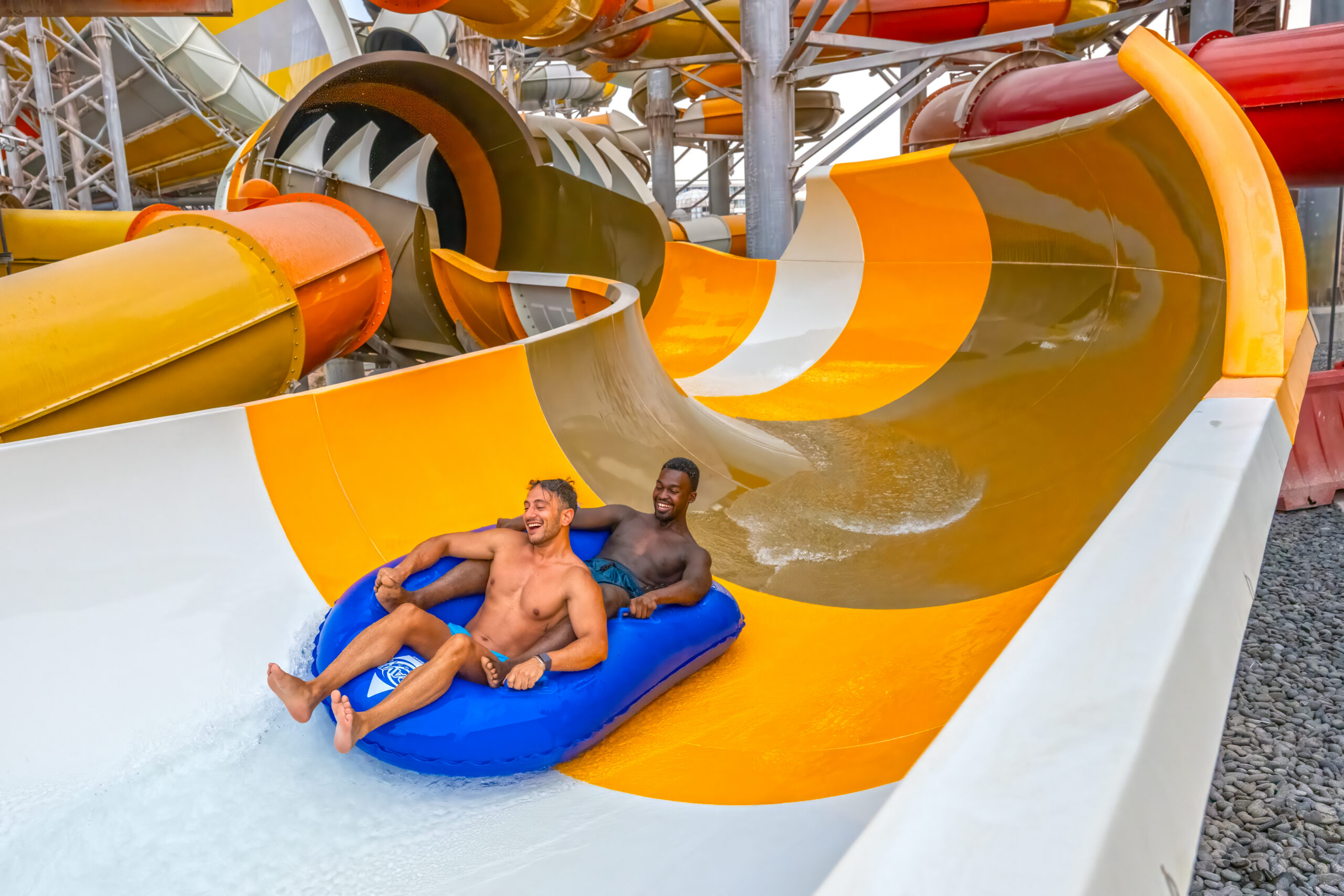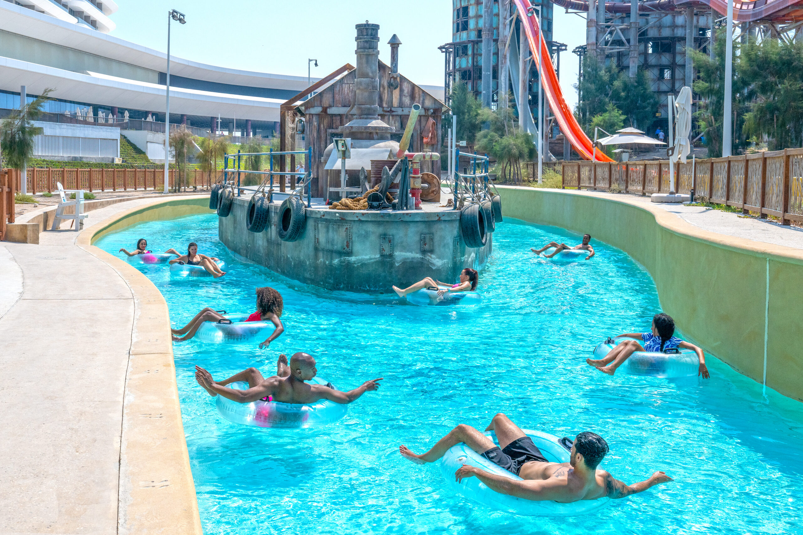 Partnering with Qetaifan Projects, WhiteWater supplied the water attractions for the 280,000+ square meter Meryal Waterpark on Qetaifan Island North. Breaking the world record for the tallest water slide in the world, the park’s Rig 1938 is an incredible 85 meters (260 feet)—just four meters (13 feet) shy of Big Ben. In addition to breaking a world record for the tallest water slide, the Rig 1938 also features the most water slides on a single tower, including an Abyss at 40 meters high.