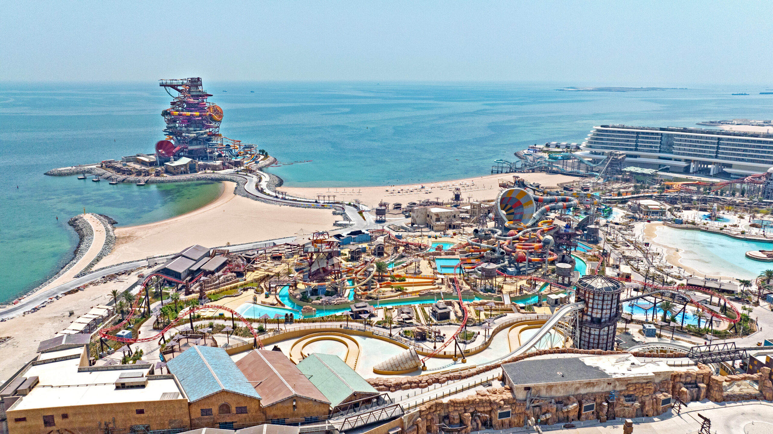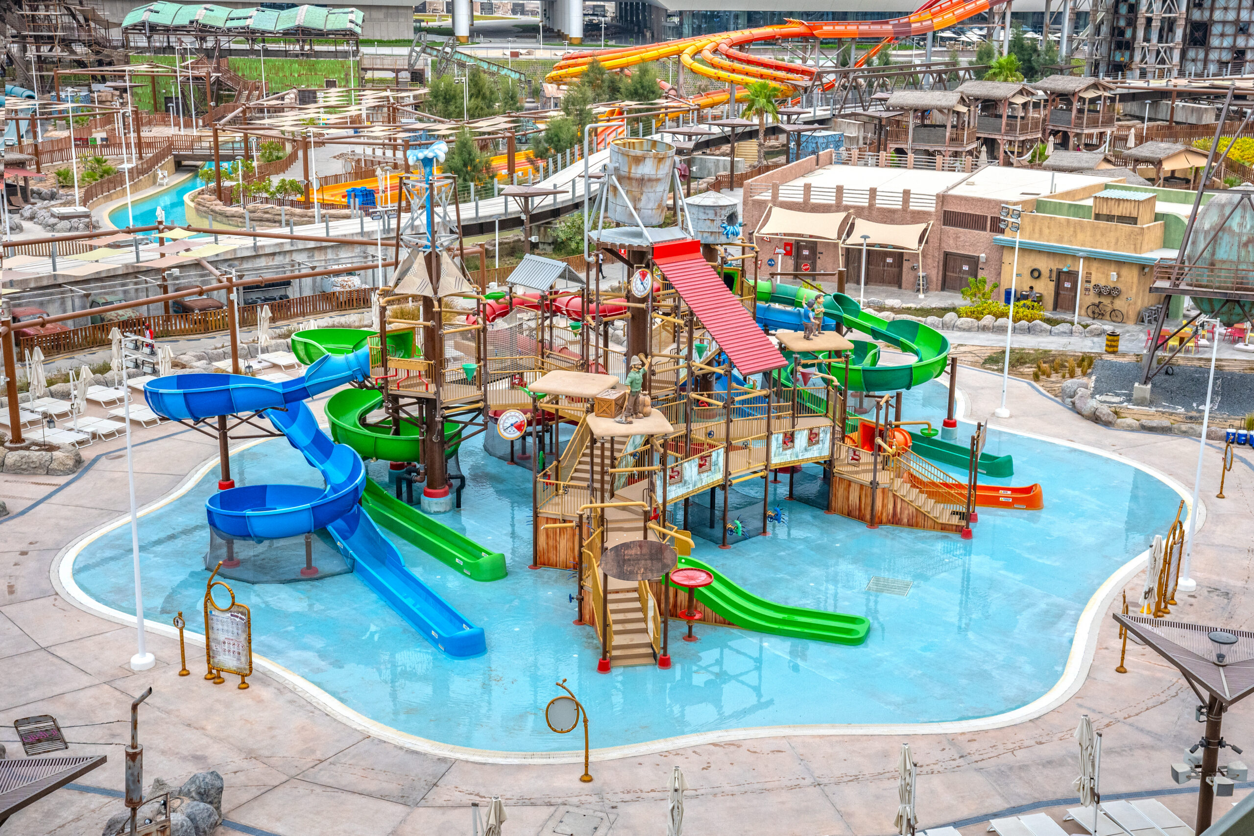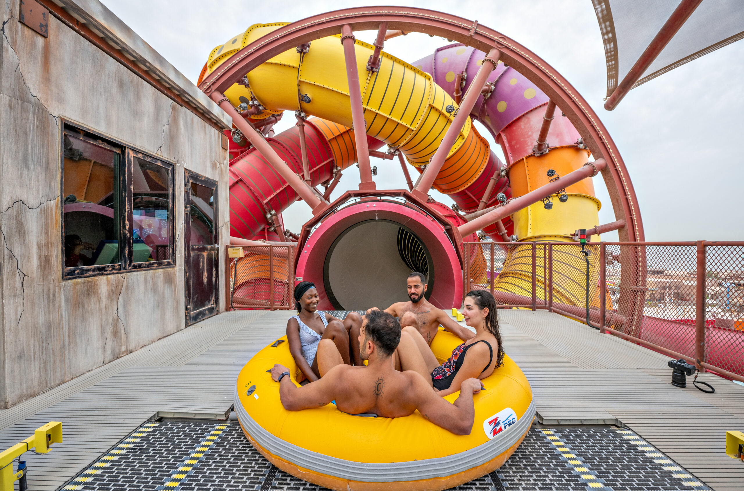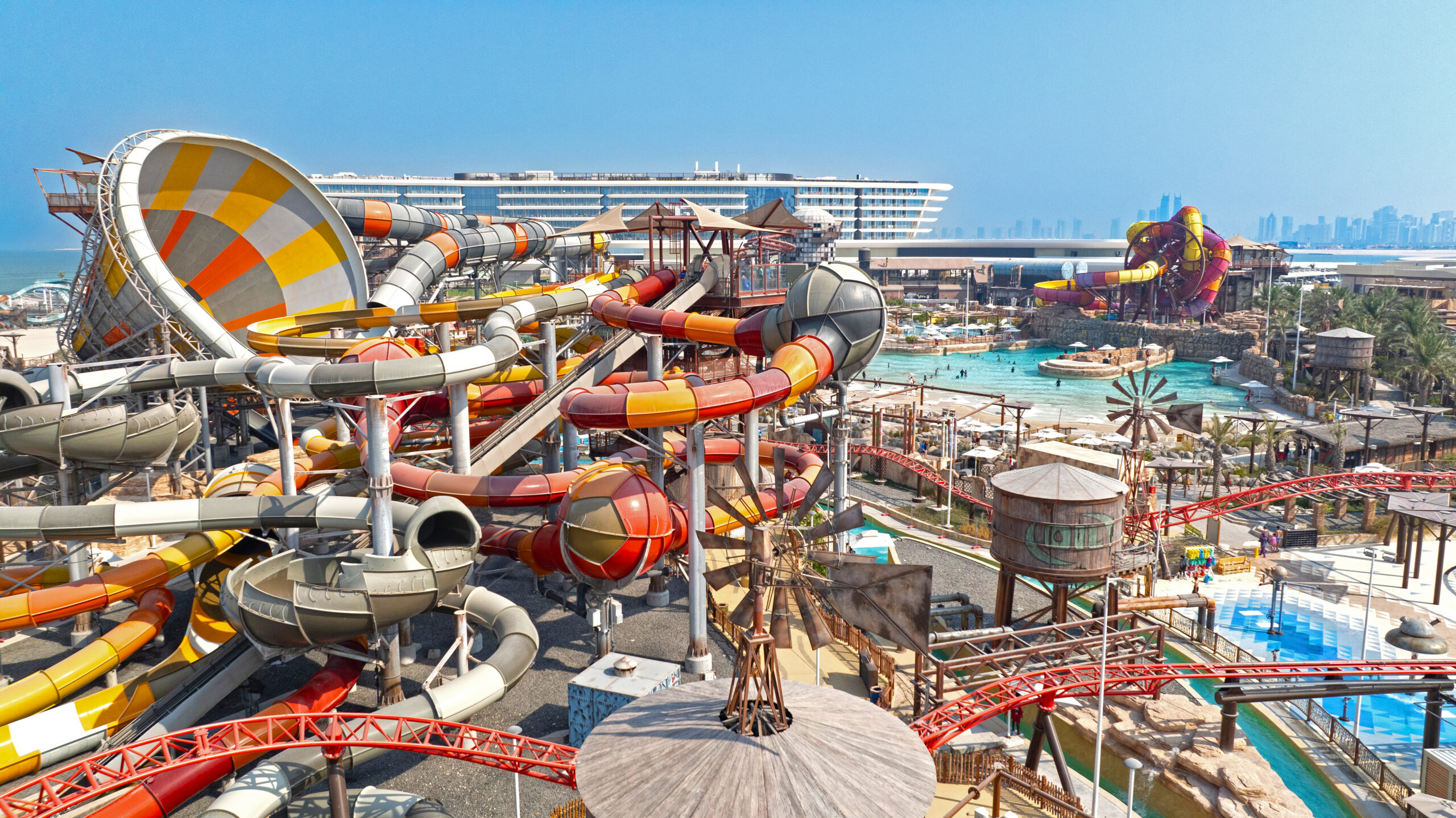 Partnering with Qetaifan Projects, WhiteWater supplied the water attractions for the 280,000+ square meter Meryal Waterpark on Qetaifan Island North. Breaking the world record for the tallest water slide in the world, the park’s Rig 1938 is an incredible 85 meters (260 feet)—just four meters (13 feet) shy of Big Ben. In addition to breaking a world record for the tallest water slide, the Rig 1938 also features the most water slides on a single tower, including an Abyss at 40 meters high.