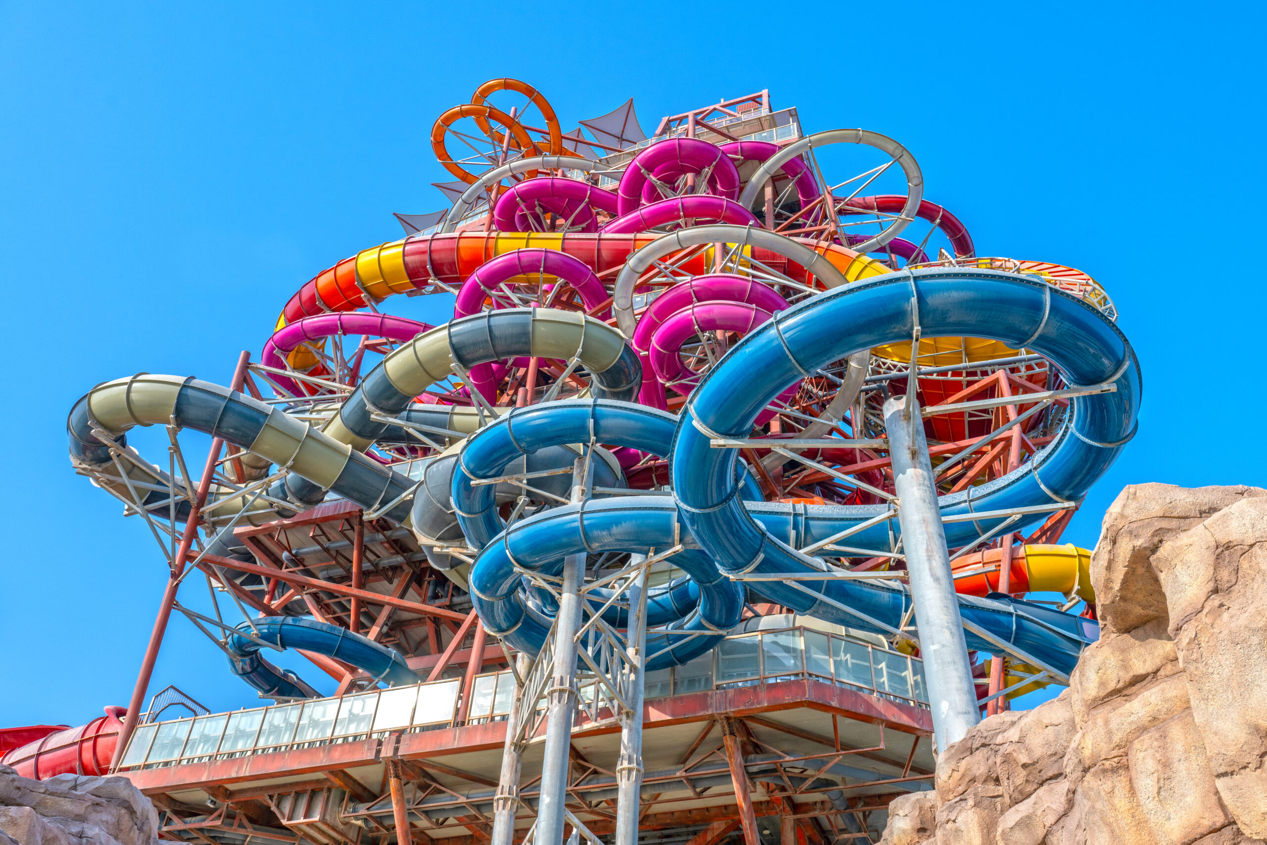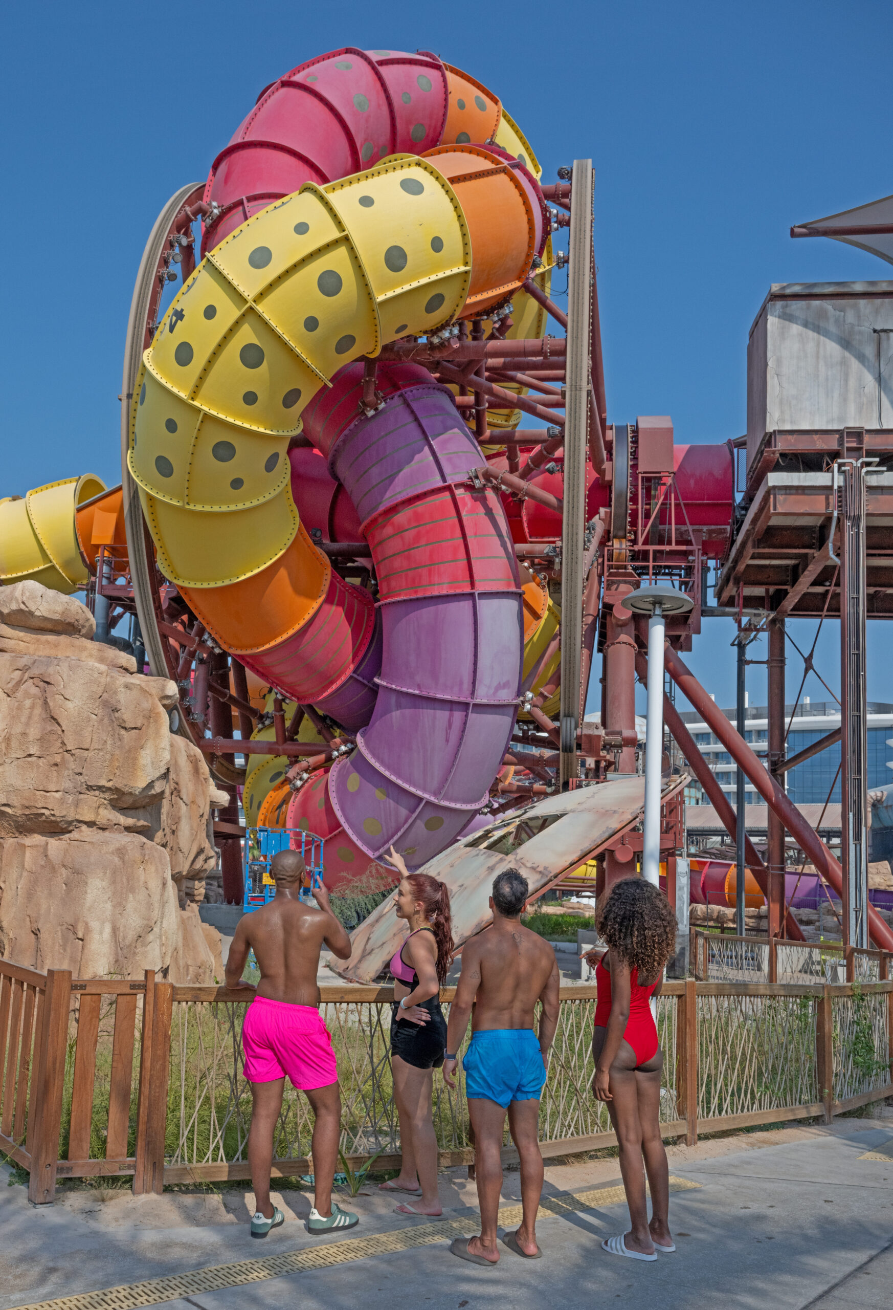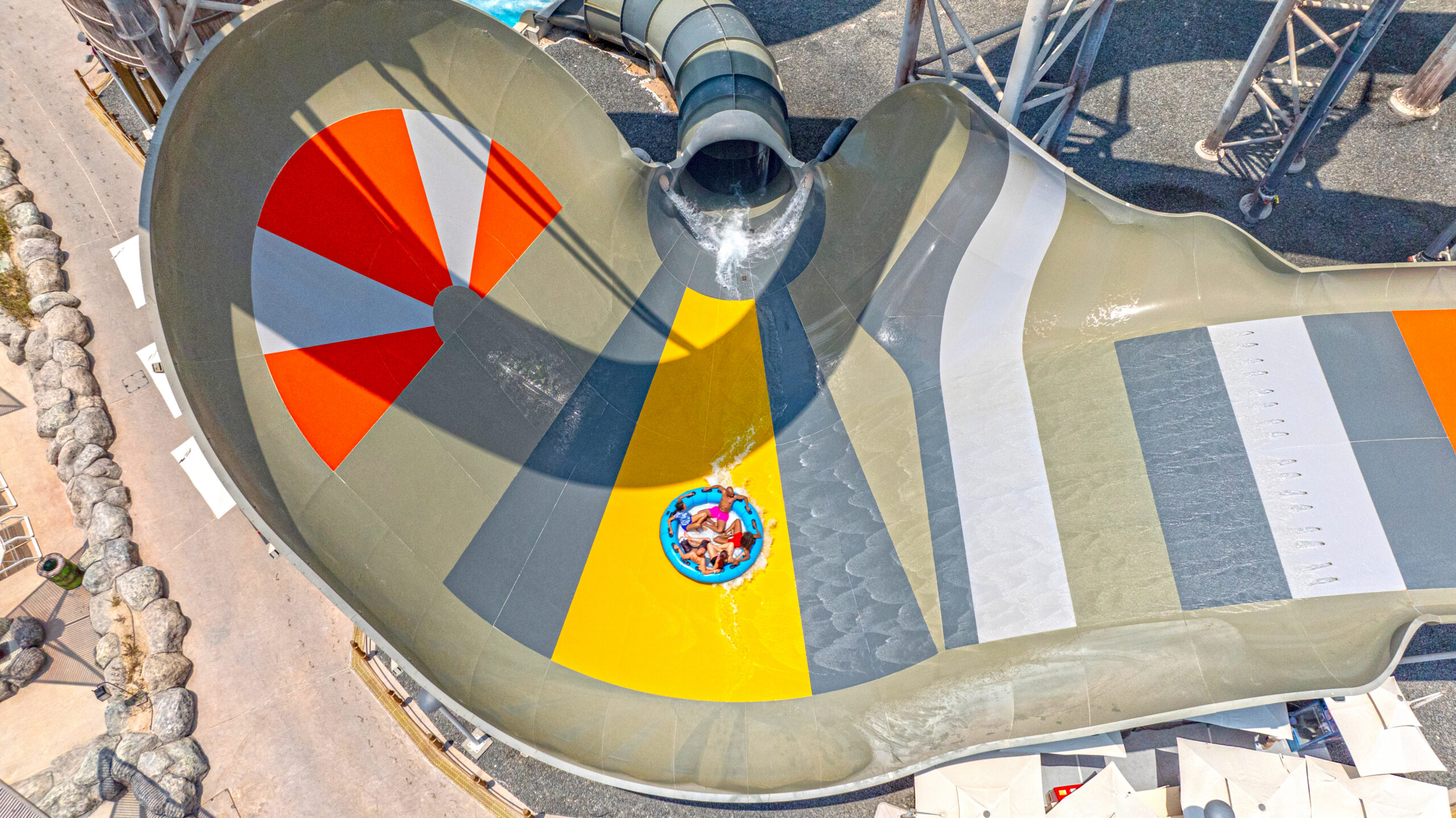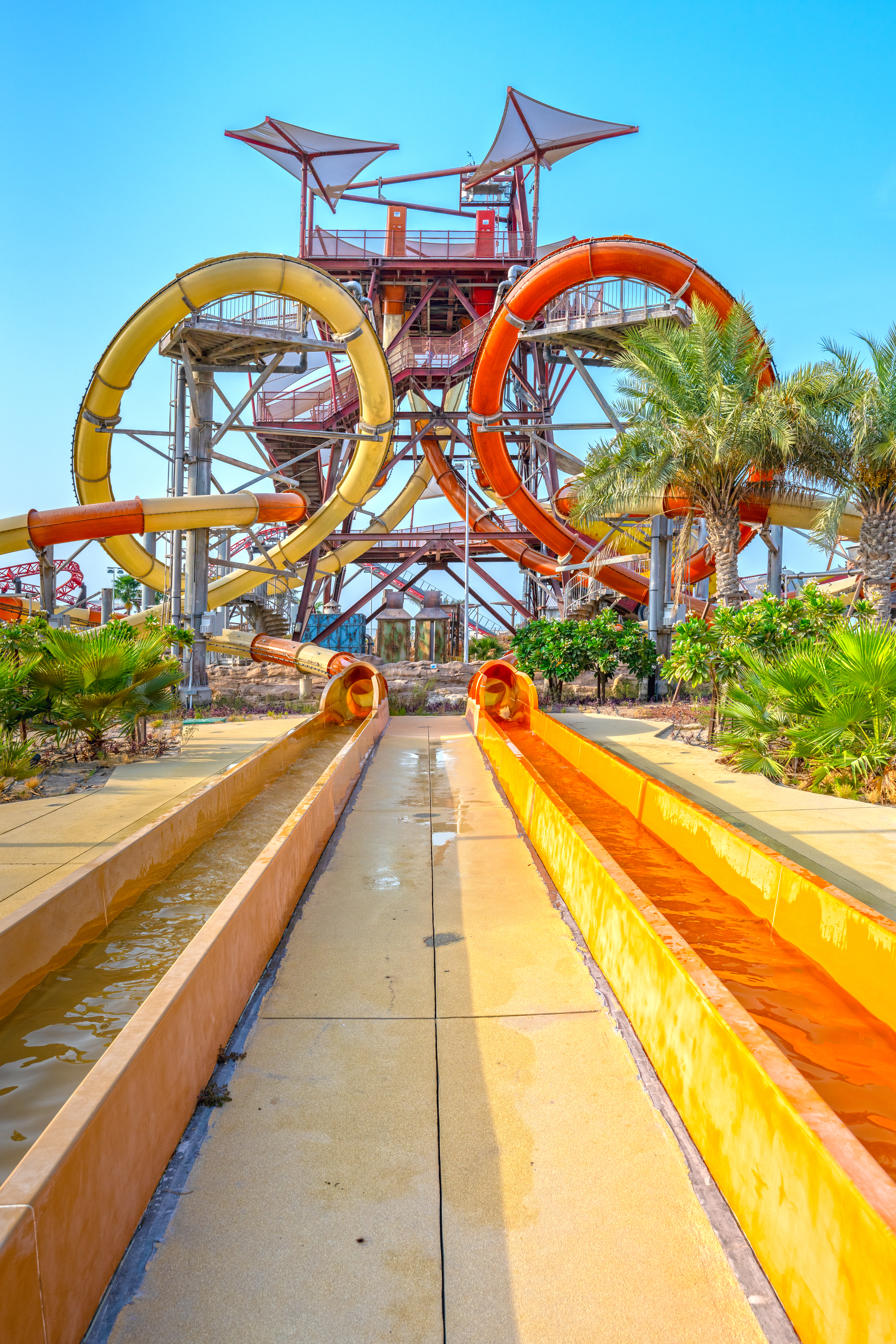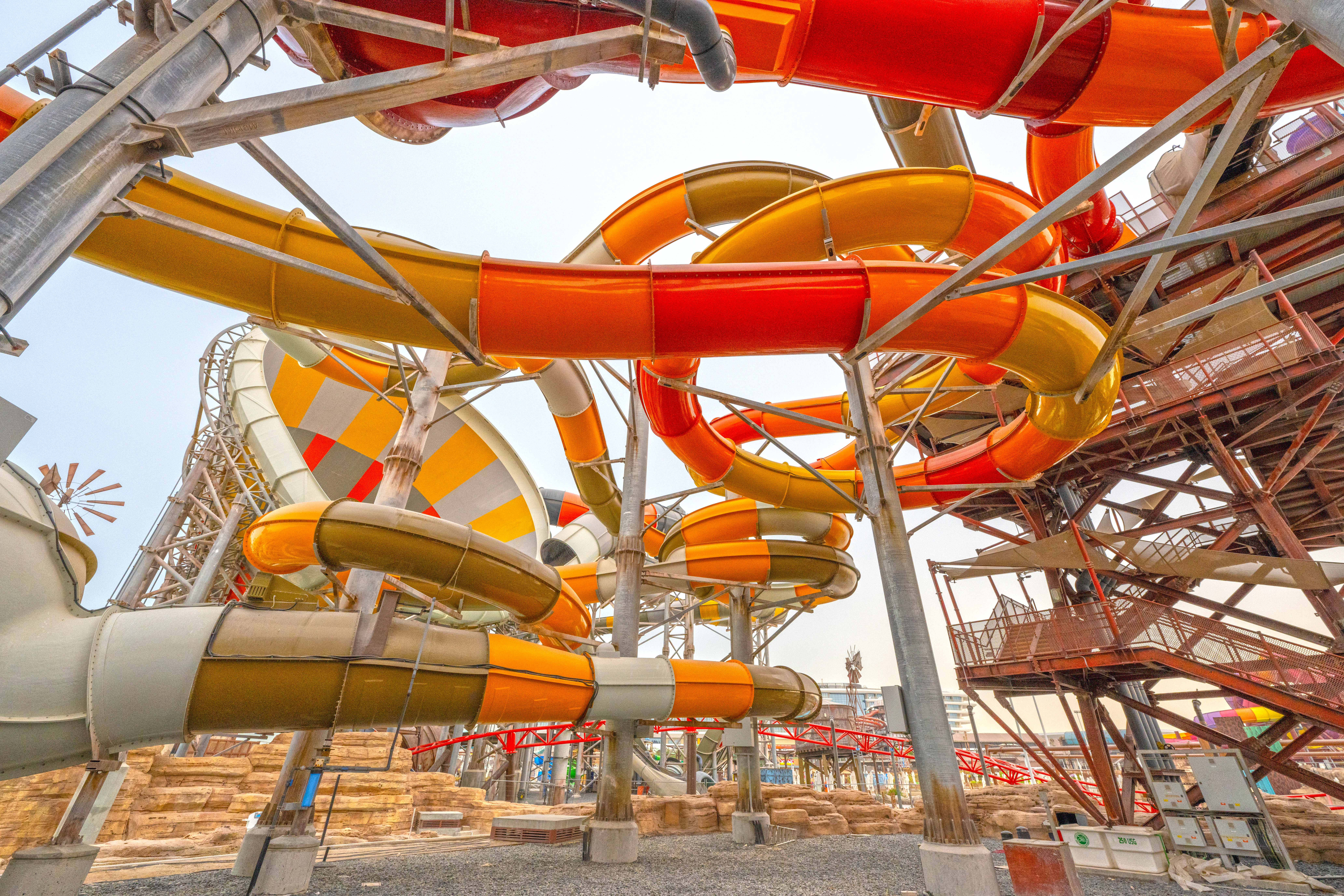 Partnering with Qetaifan Projects, WhiteWater supplied the water attractions for the 280,000+ square meter Meryal Waterpark on Qetaifan Island North. Breaking the world record for the tallest water slide in the world, the park’s Rig 1938 is an incredible 85 meters (260 feet)—just four meters (13 feet) shy of Big Ben. In addition to breaking a world record for the tallest water slide, the Rig 1938 also features the most water slides on a single tower, including an Abyss at 40 meters high.